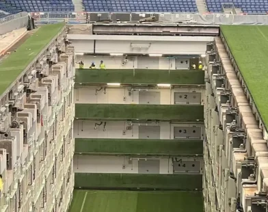 Real Madrid’in Santiago Bernabéu’suna 44 milyon euroluk yüksek teknolojili çekilebilir zemin altyapısı kuruldu, yıl boyu kalite sağlıyor. Real