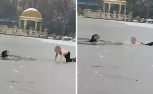 Çin'in Luoyang kentinde bir parkta meydana gelen olayda, bir baba, donmuş göle düşen bir çocuğu kurtarmak için hayatını