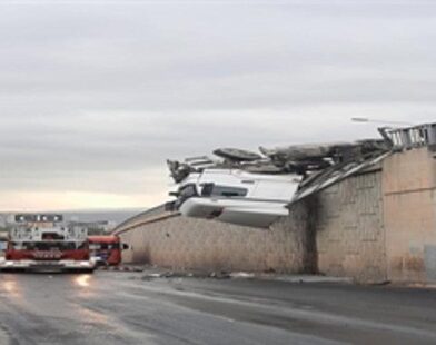 İzmir İtfaiyesi kaza sonrası viyadükte asılı kalan tır şoförünü kurtardı