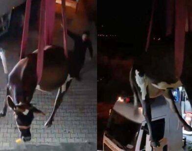 Dama çıkan inek vinçle indirildi