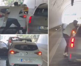 Tünelde kavga: Diğer aracın camını yumrukladı