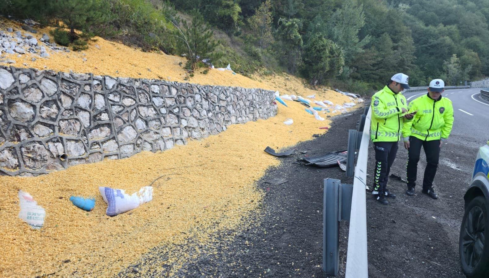 TIR’da yüklü hayvan yemleri kaza nedeniyle yol kenarına saçıldı.