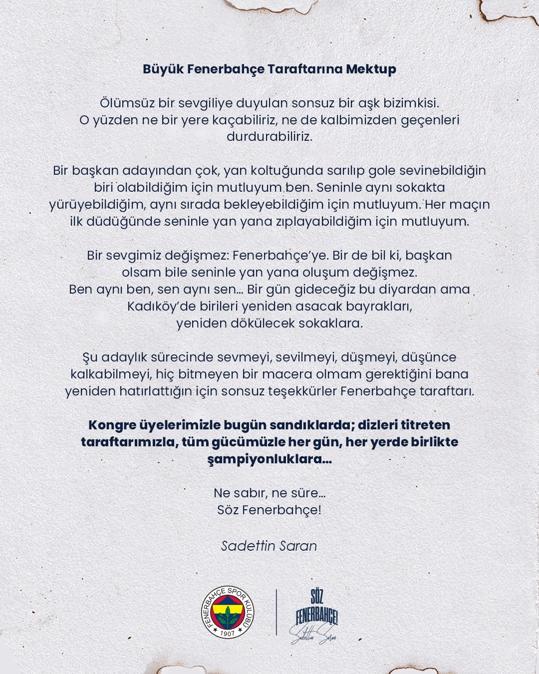 Fenerbahçe lider adaylarından Sadettin Saran, sarı-lacivertli taraftarlara teşekkür etti ve ileti yolladı.