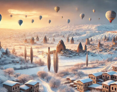 Kapadokya’da kış masalı başladı, balonlar karda yükseldi.