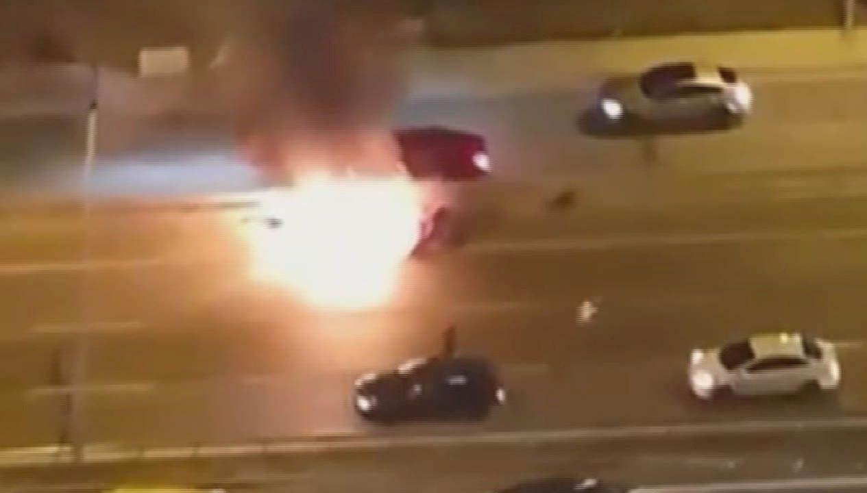 Sürücü ve beraberindekiler araçtan indi. Alevler kısa müddette arabası sardı, vakit zaman patlamalar meydana geldi.