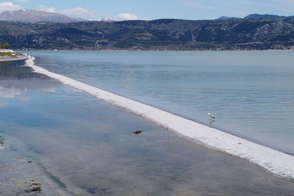 Eğirdir Gölü kıyısında, adaya uzanan sahilde sediment birikimiyle doğal bir yürüyüş yolu ortaya çıktı.