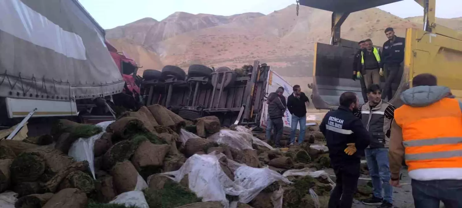 Erzincan-Sivas kara yolunda gerçekleşen kazada, kontrolden çıkan çim yüklü tır ile diğer bir tır çarpıştı.