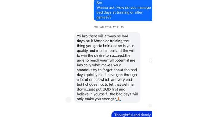 “Kardeşim, her vakit berbat günler olacak. İster maçta ister antrenmanda… Ancak tutunman gereken şey, sahip olduğun kalite ve en kıymetlisi kazanma isteğin. Başarma isteği, potansiyelinin tamamına ulaşma dürtüsü… bunlar seni başkalarından ayıran şeylerdir. Makûs günleri mümkün olduğunca çabuk unutmaya çalış, tamam mı?”