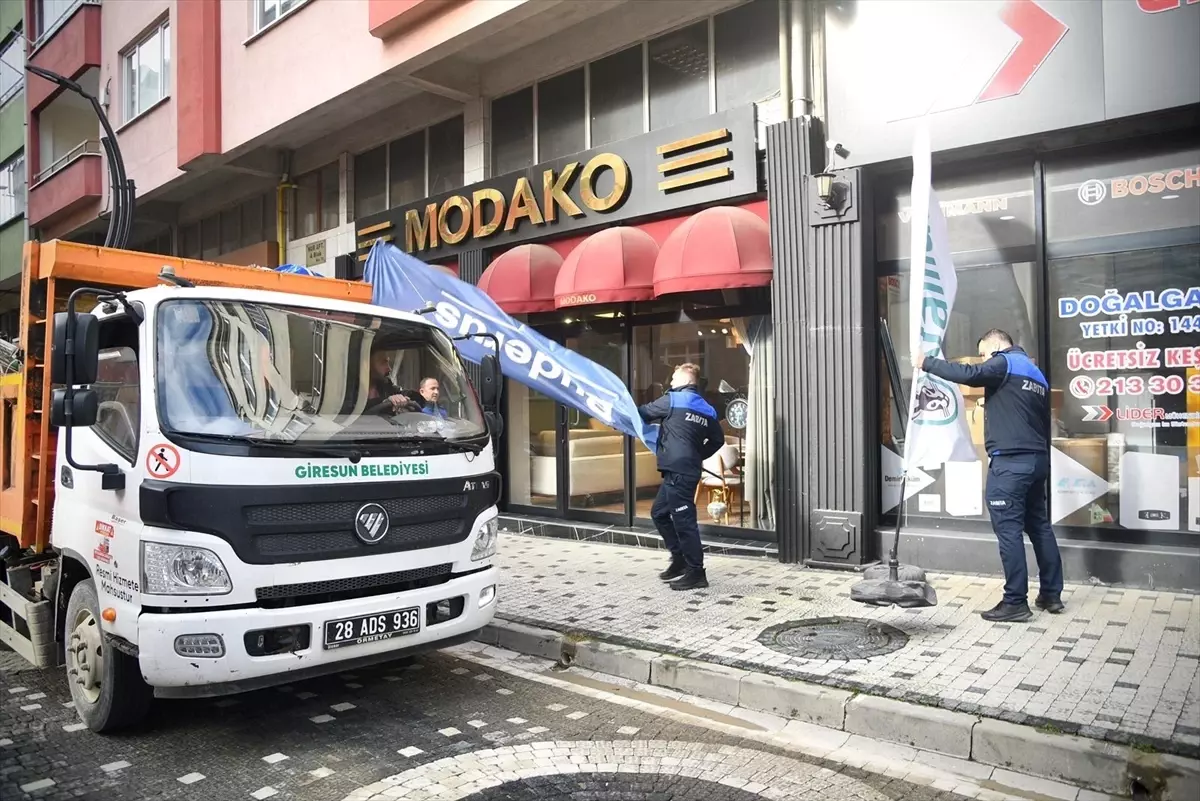 Giresun Belediyesi ekipleri, kaldırım ve yol kenarlarına konulan reklam panoları, bayrak, flama ve duba gibi malzemeleri topladı.