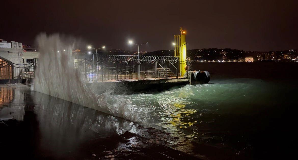 Kıyıya vuran yüksek dalgalar, Beşiktaş kıyı mevkiinde görüntülendi.