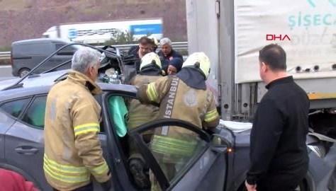 İstanbul’un Sancaktepe ilçesinde Kuzey Marmara Otoyolu’nda araba TIR’ın altında kaldı.