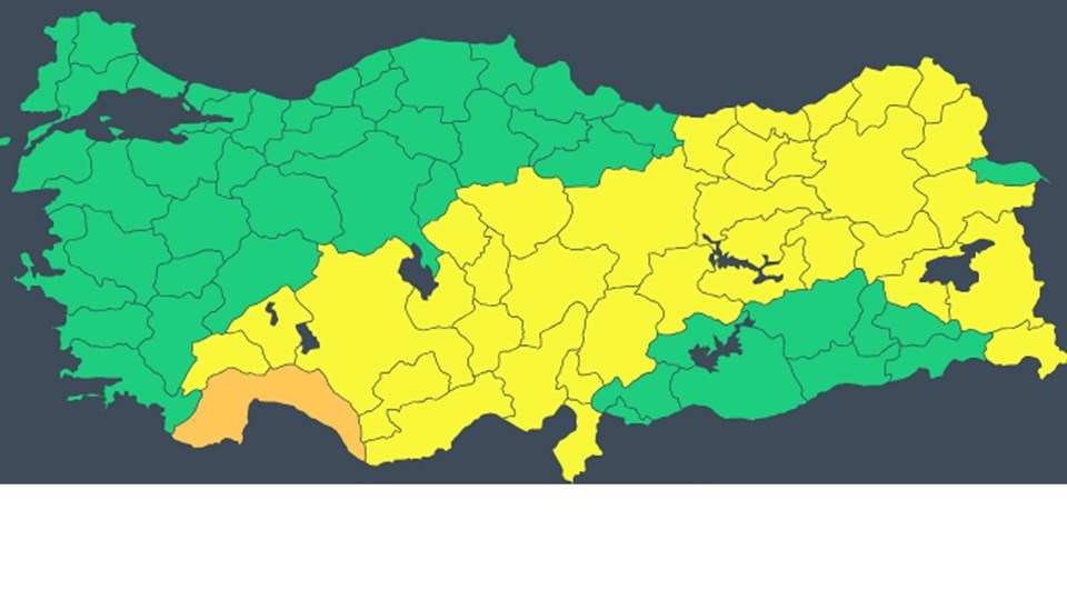 Meteoroloji 36 vilayet için ikaz yayınladı. 35 vilayet için sarı, Antalya için ise turuncu kodlu ihtar yayınlayan MGM, Akdeniz’in iç bölümleri, İç Anadolu’nun güney ve doğusu, Doğu Karadeniz’in iç kesitleri ile Doğu Anadolu’nun kuzey ve doğusunda yer yer fırtınaya varan kuvvetli rüzgar beklendiğini bildirdi.