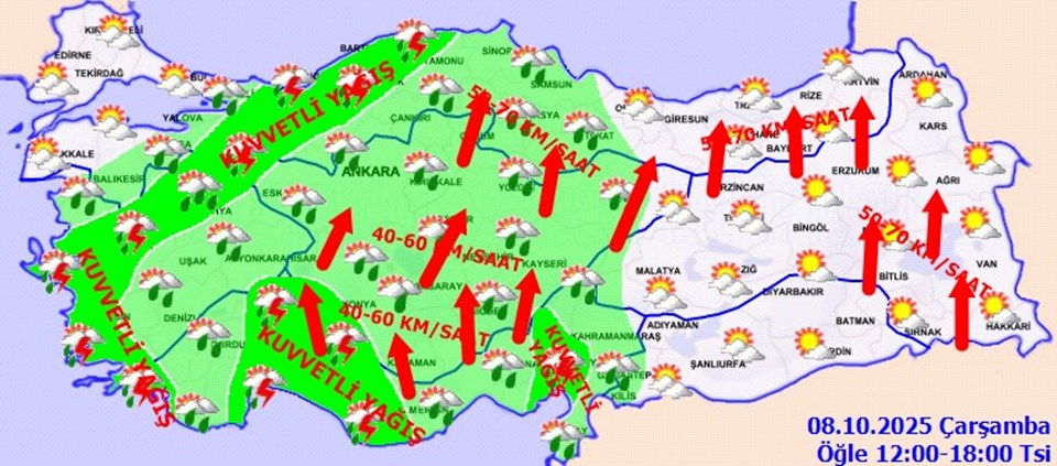 Marmara, Ege, Akdeniz, İç Anadolu ve batı ve orta Karadeniz, ile Samsun, Giresun, Gaziantep ve Kilis etraflarında sağanak yağış bekleniyor. Sağanağın İzmir, Muğla, Aydın, Manisa, Kütahya, Sakarya, Bilecik, Bursa’nın doğusu, Isparta, Burdur, Bolu, Karabük, Zonguldak, Bartın, Düzce, Anamur, Osmaniye etrafları ile Adana’nın doğu, Hatay’ın kıyı bölümlerinde kuvvetli, Antalya’nın doğu ilçelerinde ise çok olacağı iddia ediliyor.