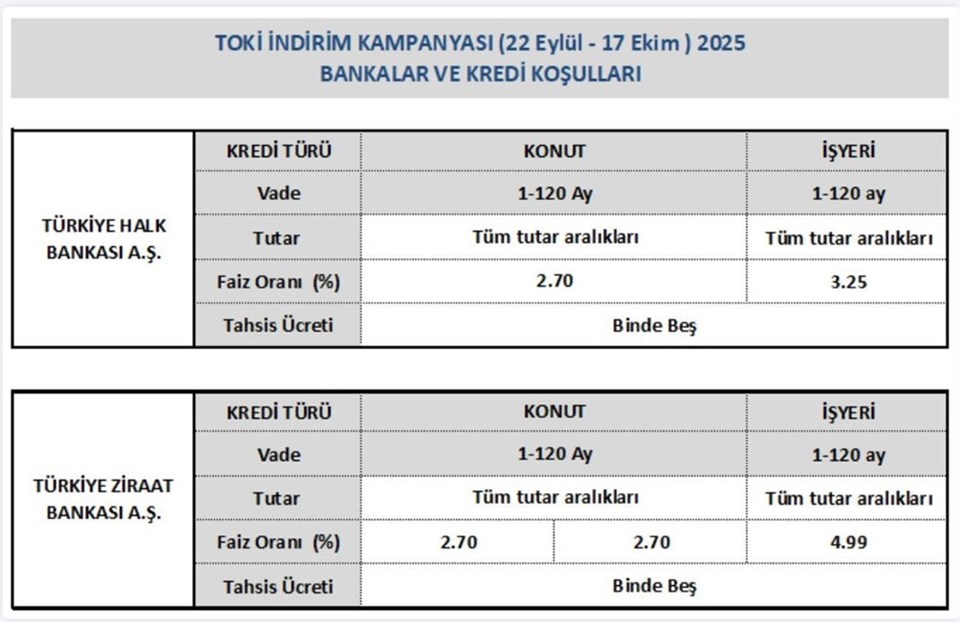 TOKİ’nin resmi internet sitesinde yer alan bilgilere nazaran; Ziraat Bankası ve Halkbank’ta 120 aya kadar olan konut kredilerinde faiz oranı yüzde 2,70 olarak belirlenmiş durumda. İşyeri alımları için ise Halkbank yüzde 3,25, Ziraat Bankası ise yüzde 4,99 faiz oranı uyguluyor.