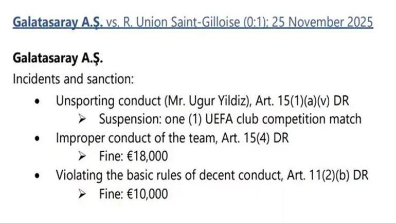 UEFA Disiplin Kurulu tarafından Galatasaray’a, Şampiyonlar Ligi’ndeki karşılaşmalardan ötürü çeşitli cezalar verildi. 25 Kasım’da İstanbul’da sarı-kırmızılıların Union Saint-Gilloise ile olan maçında sportmenliğe alışılmamış davranıştan ötürü Futbol A Ekibi İdari Yöneticisi Uğur Yıldız, UEFA karşılaşmalarından bir maç men edildi.