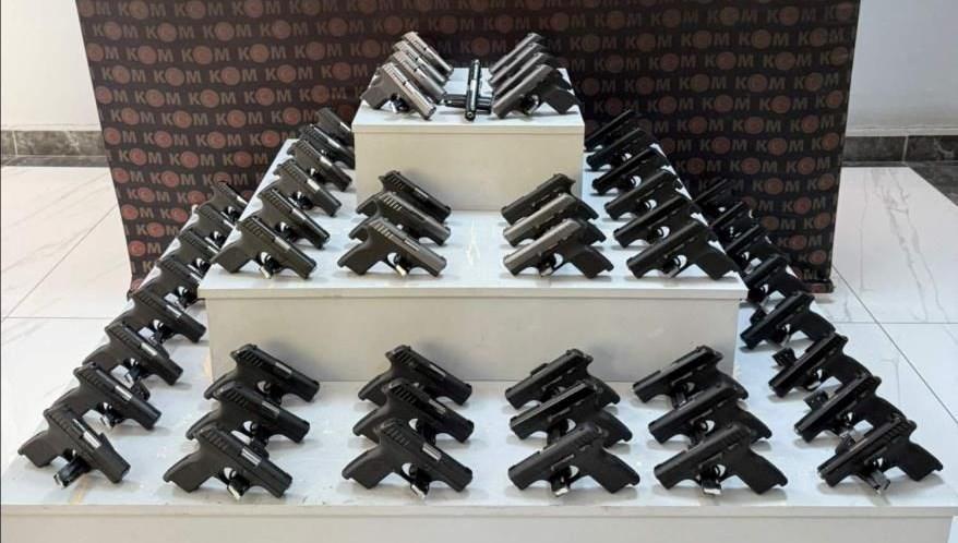 Ekiplerin otobüsün bagajında yaptığı aramada, iki valiz içerisinde toplam 55 adet ruhsatsız tabanca ve tabancalara ait 55 adet şarjör bulundu.