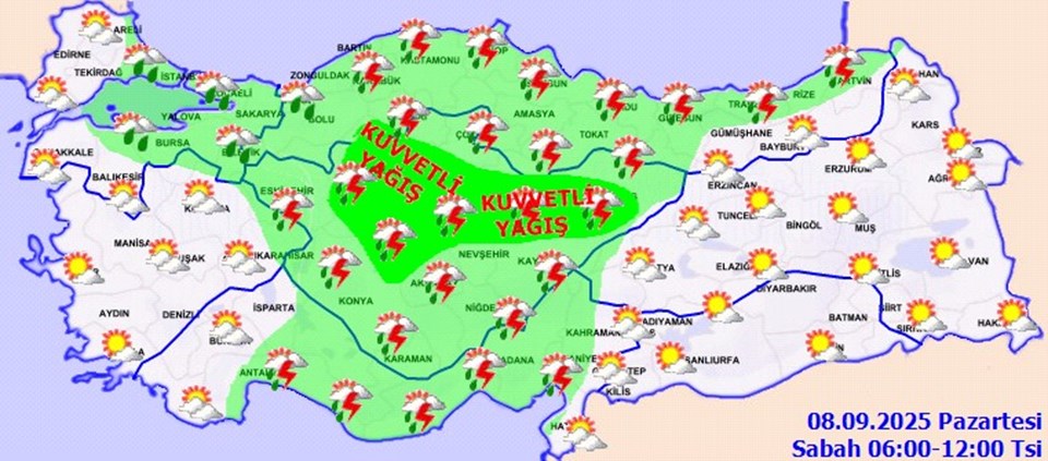 MGM Ankara, Çankırı, Kırşehir, Sivas, Yozgat ve Kırıkkale çin sarı kodlu kuvvetli yağış uyarısı yaparken; yurt genelinde sıcaklıklar 3 ile 5 derece düşecek.